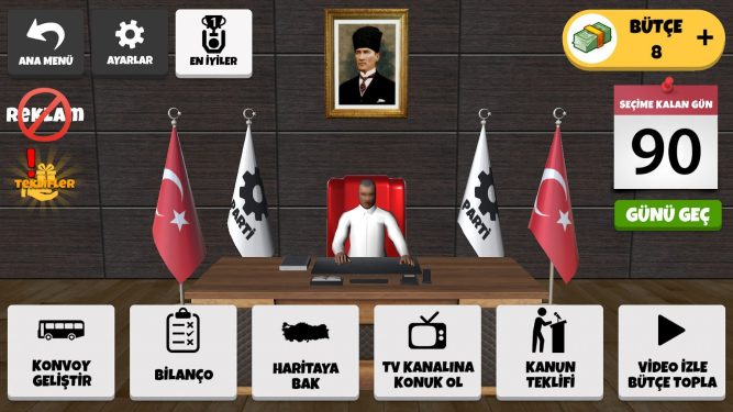 Seçim Oyunu Partiler Yarışıyor Apk v2.5.2 Son Sürüm Full İndir Android Mobil Tablet Telefon için olan bu oyun’da Türkçe Dil olarak türkiye’de genel seçimler yerel seçimler tüm seçim türleri modları ile partiler yarışacak ve ister isek kendi partimizi birinci yani kazanmasını sağlmak için kampanyalar yürüteceğiz Seçim Oyunu Apk Modlu olarak full içerikli oynayabileceğiz ücretsiz hızlı tek linkler’den direkt indirebilirsiniz Seçim Oyunu Partiler Yarışıyor Hile Apk,Seçim Oyunu Partiler Yarışıyor ModApk