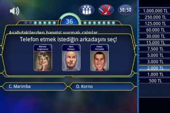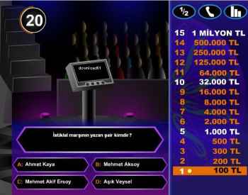 Hem PC hem de Android cihazlarıyla tamamen uyumlu olan Kim 500 Bin YTL İster oyununda bilginizi ölçerek para kazanmaya hazır mısınız? Düşük boyutlu olmasıyla birlikte ücretsizce de indirme özelliğiyle size uygun olan cihazınızla oyuna başlayarak 1.sorudan itibarek 15.soruya kadar gelmeye çalışacak ve final sorusuyla büyük paranın sahibi olacaksınız. Takıldığınız bir soru üzerinde 3 joker hakkınızdan dilediğinizi kullanarak işinizi kolaylaştırabileceksiniz. İster seyiciye sorun, ister %50 hakkınızı kullanın, istersenizde arama yapın. Tamamen sizin eliniz.