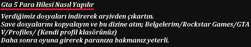 Gta 5 Para Hilesi + Kayıtlı Oyun Sınırsız Para İndir Bu Hile İle Birlikte Grand Thef Auto V Oyunun’da sınırsız paramı olacak ve istediğimiz herşeyi satın alabileceğiz arablar uçaklar evler lüks binalar motorlar yatlarımız katlarımız olacak ve özgürce istediğimiz gibi harcamalar yapabileceğiz ve Oyun %100 Bitmiş Save İle Ana Görevleri Yan Görevleri Tüm Görevleri Tamamlanmış Olacak Hızlı Tek Linkler’den İndirebilirsiniz Gta 5 Para Hilesi Nasıl Yapılır Save Dosyası Nasıl yapılır Detaylı Anlatım Mevcut Eğlenceli Oyunlar