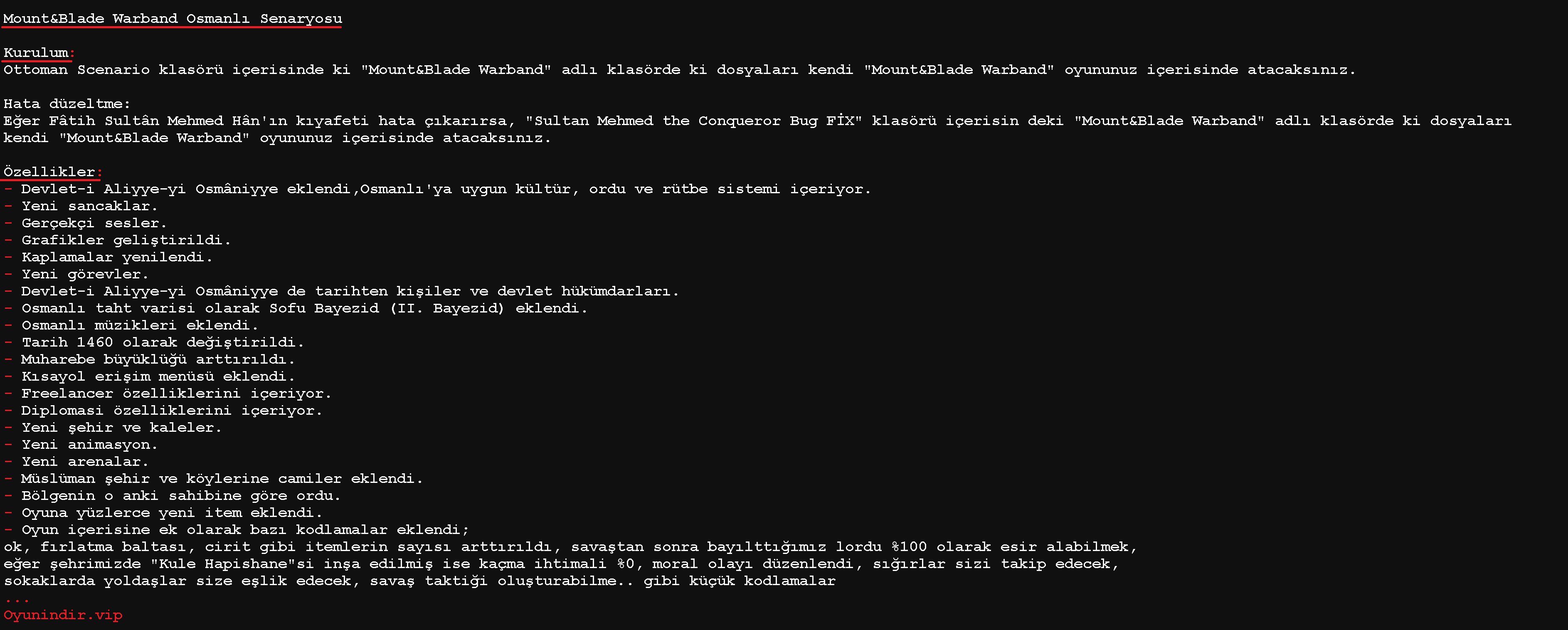 Mount And Blade Warband Osmanlı Modu Türkçe Full İndir Bu yama ile birlikte Mount And Blade Warband’ta Osmanlı döneminin’de farklı bir deneyim yaşayacağız Ayrıca bu mod İle Birlikte Gelen Devlet-i Aliyye-yi Osmaniyye yaması ve Fatih Sulan Mehmed Han’ın Öncülük ettiği kudretli devleti kontrol etip yöneteceğiz ve oyun’da Türkiye haritası yani Andolu Toprakları Sırbistan Krallığı Macar,Moldovya,Litvanya,Kıbrıs,Trebizon,Morea Ve Birçok develt imparatorluğun içerisin’de olduğu harika bir yama Full Türkçe Dil Olarak oynayabileceksiniz Mount And Blade Warband Osmanlı Modu Nasıl Kurulur Videolu Ve Görsel Anlatım Mevucuttur Eğlenceli Oyunlar
